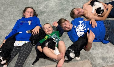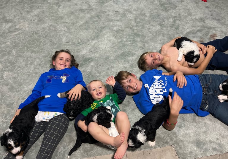 We are a dedicated family raising Bernedoodles with love and care. They are raised in our home, among our 4 children. They receive no shortage of attention! Our first litter, and the puppies you see on this page were F2 meaning that mom and dad were both F1 (bernese x poodle) bernedoodles. The upcoming litter is F1B. These little loves will all be furnished with soft hypoallergenic coats and the typical doodle look.